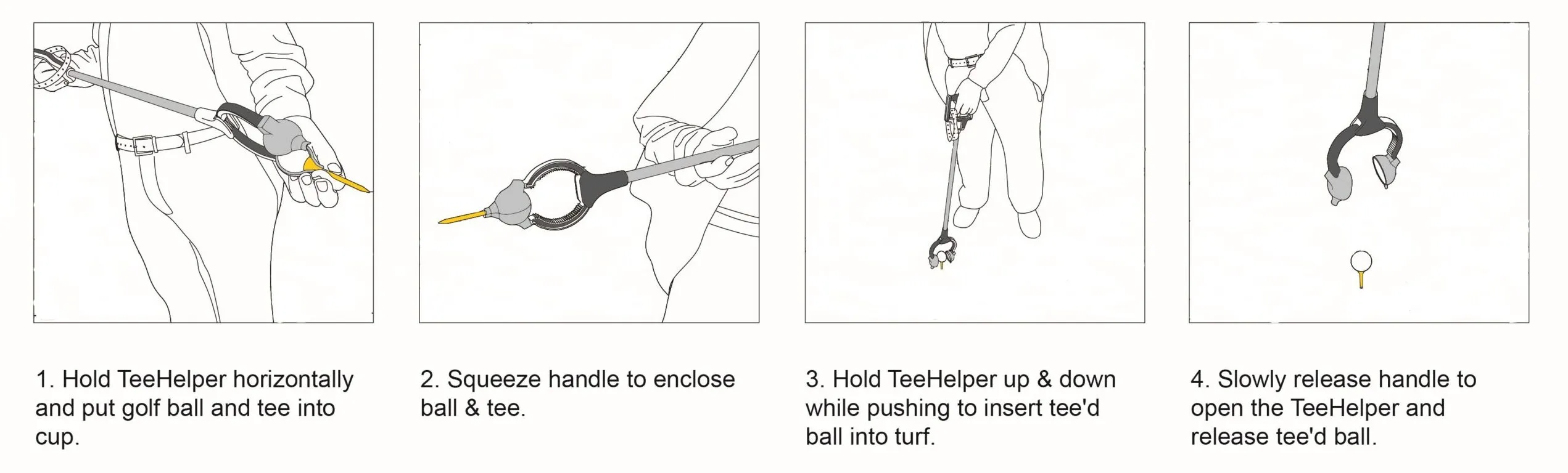 -Keeping a firm grip on the handle, let the TeeHelper swing down to a vertical position. Holding as vertically as possible, push the tee into the turf to the desired height. (The height can be re-adjusted by re-gripping the ball and tee and then moving it up or down.) -Slowly release the grip to free the ball sitting atop the tee. If the ball happens to fall off the tee simply pick up the ball with the TeeHelper and slowly open the device while holding it over the tee. Or just pick up both and repeat the whole process.